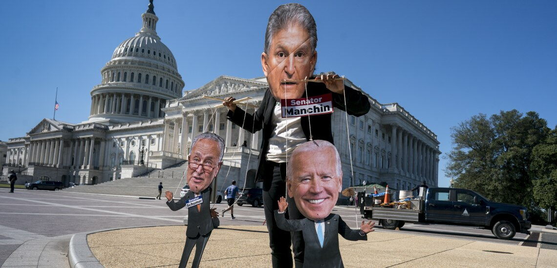 Biden als Marionette von Manchin: Protest eines Klimaaktivisten vor dem Kapitol Mitte Oktober.
