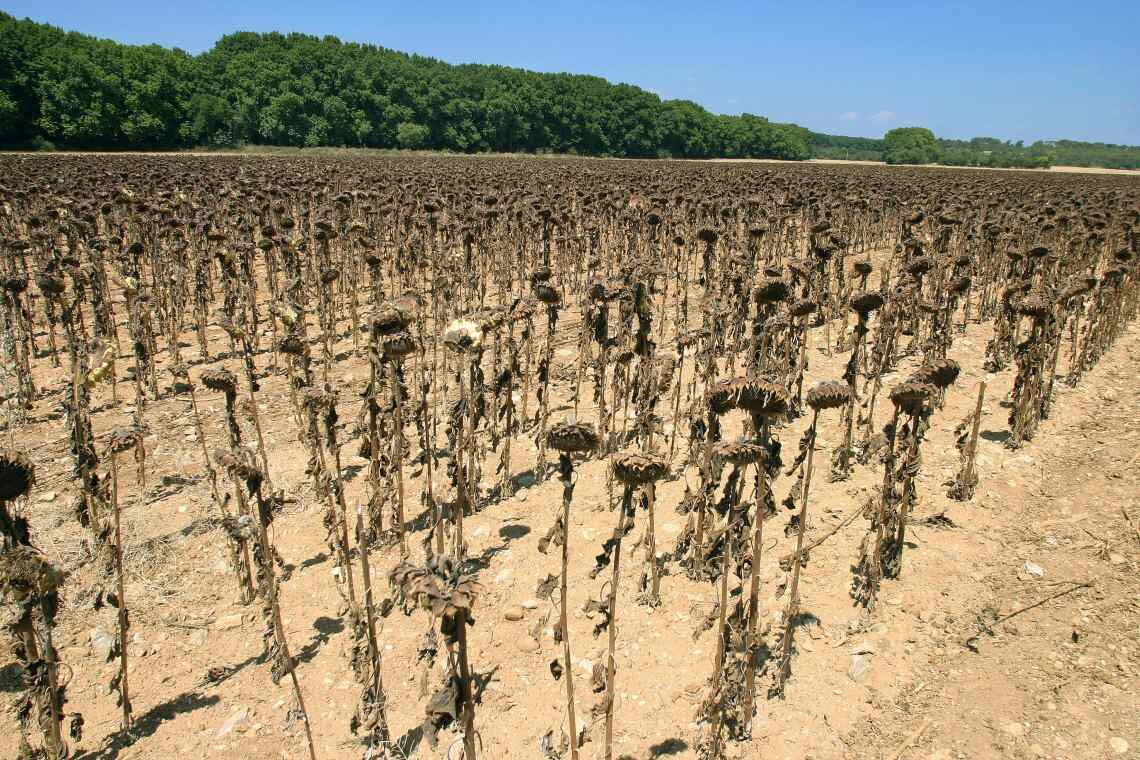 Während Orkane binnen Stunden oder Tagen Schneisen der Verwüstung schlagen können, zeigen sich die Folgen von Hitzewellen und Dürren erst mit der Zeit. Im Sommer 2006 gleicht Südfrankreich einem Backofen. Diese verdorrten Sonnenblumen stehen auf einem Feld in der Nähe von Montpellier.