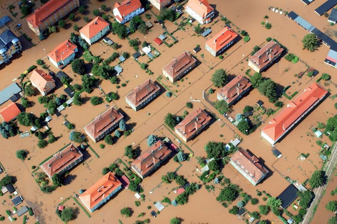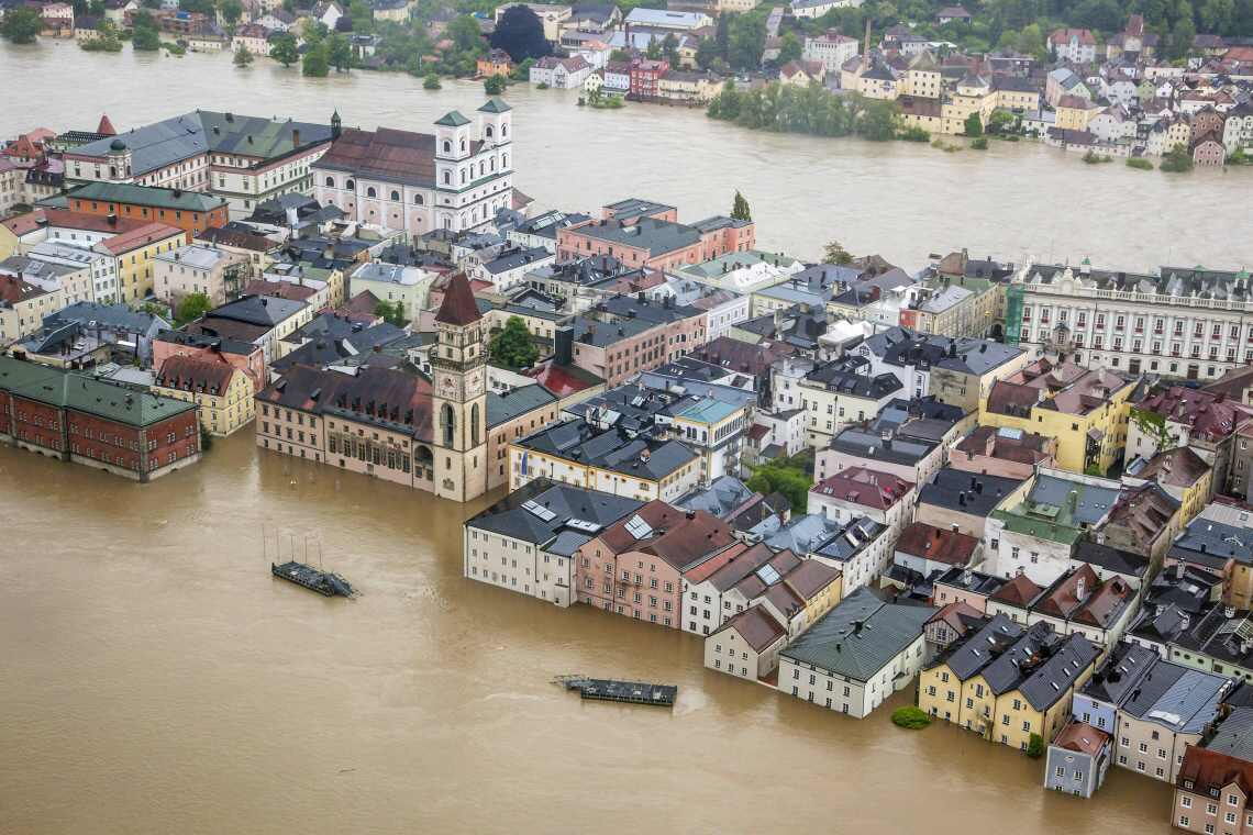 Als die Donau nur elf Jahre nach dem letzten Jahrhunderthochwasser im Juni 2013 wieder in katastrophalem Maß über die Ufer tritt, beginnen sich die Menschen zu fragen, ob der Begriff in Zeiten der Klimakrise noch zutrifft. Das Foto zeigt die überflutete Altstadt von Passau mit dem historischen Rathaus.