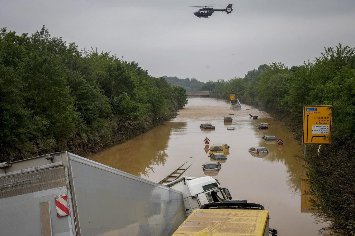 Erftstadt in Nordrhein-Westfalen ist einer der am heftigsten vom Hochwasser im Juli 2021 getroffenen Orte. An Bilder wie dieses von einer überfluteten Bundesstraße werden sich die Menschen noch in vielen Jahren erinnern. Noch immer lässt sich das ganze Ausmaß der Katastrophe nicht abschätzen.