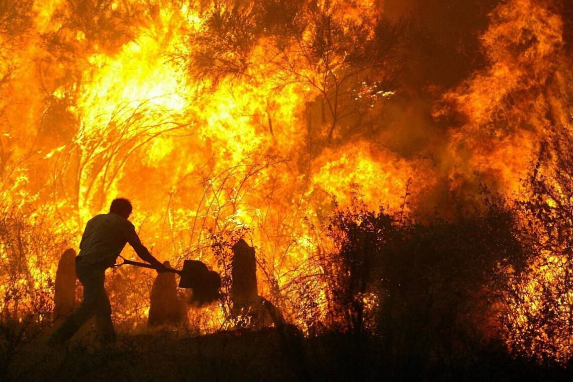 Immer häufiger stehen in Südeuropa große Waldflächen in Brand. Hier kämpft ein Mann in Portugal mit einer Schaufel und Sand gegen die Flammen. Die Brände im Juli 2004 wüten in Dutzenden Regionen des Landes zugleich. Mehrere Großfeuer drohen, sich zu einer riesigen Feuerwalze zu vereinen.