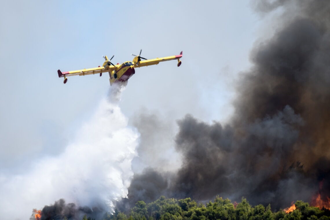 Das Bild könnte auch aus diesen Tagen stammen: Im Sommer 2020 wüten heftige Waldbrände in Griechenland und bedrohen die Hauptstadt Athen. Hier wirft ein Löschflugzeug sein Wasser in der Nähe eines Sommercamps ab, aus dem kurz zuvor die Gäste evakuiert worden sind.