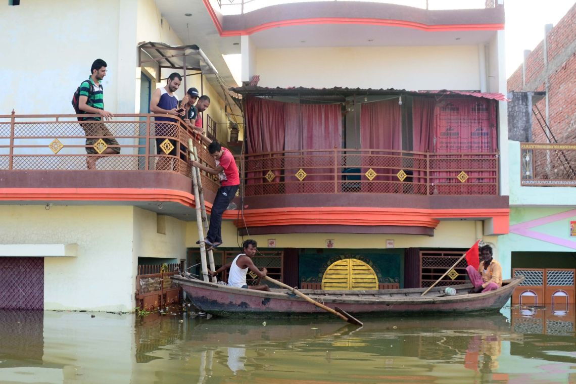 Nur noch mit dem Boot können diese Männer im indischen Bundesstaat Uttar Pradesh ihr Haus erreichen, nachdem im August 2016 heftige Regenfälle die Region überflutet haben. Viele Häuser sind dabei zerstört worden. Immerhin scheinen die Männer ihre Lage mit Humor zu nehmen.