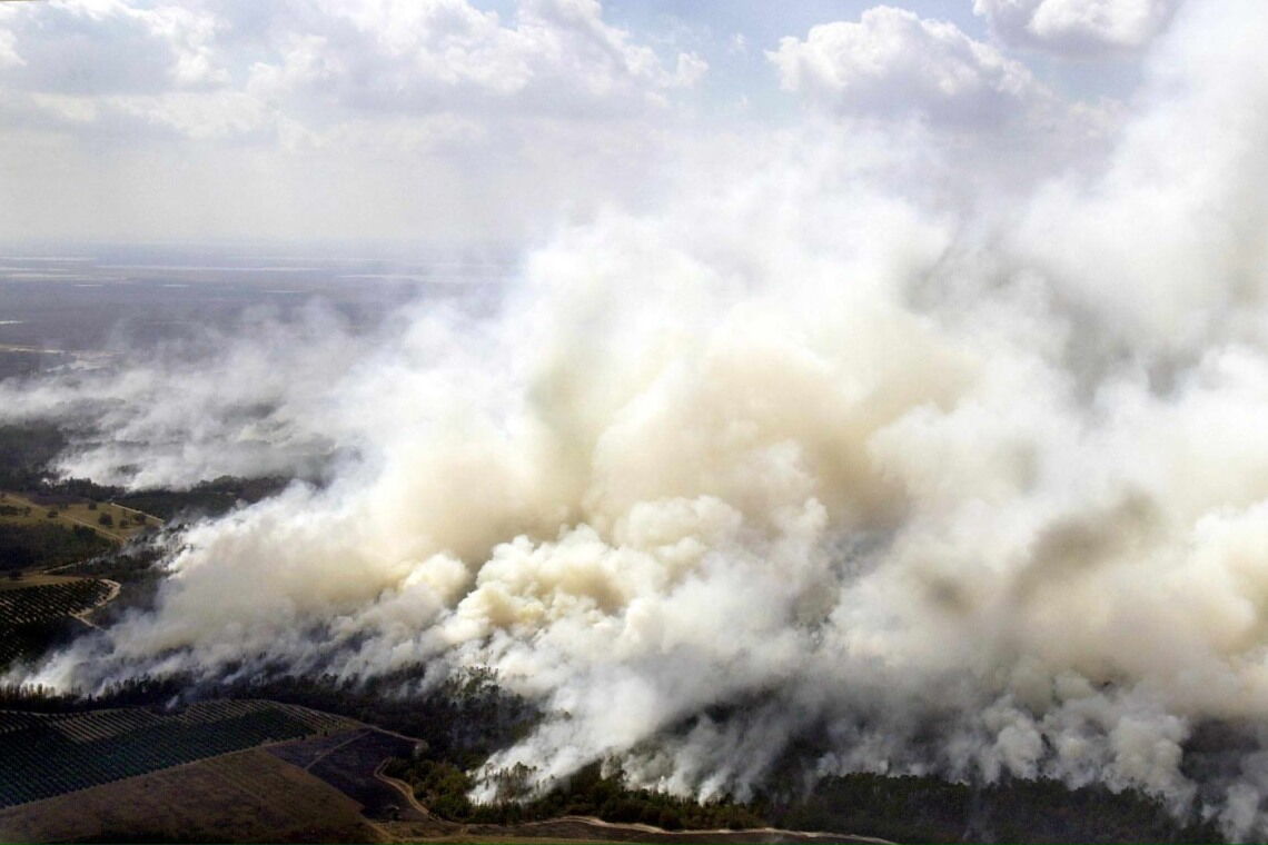 An Fotos von Waldbränden an der US-Ostküste haben wir uns in den vergangenen Jahren gewöhnen müssen. Auf dieser Luftaufnahme aus dem Februar 2001 fressen sich die Flammen allerdings nicht durch den Busch in Kalifornien oder Oregon – hier stehen Sümpfe in Florida in Flammen.