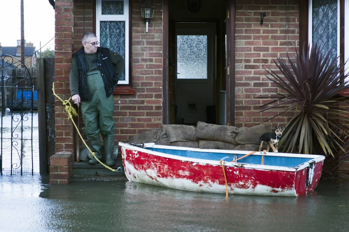 Gelassen warten dieser Mann und sein Hund darauf, dass die Fluten abziehen, die im Februar 2014 Teile von Südengland unter Wasser gesetzt haben. Endlose Regengüsse haben zuvor schmale Flüsse in uferlose Seenlandschaften verwandelt. Es ist nicht die letzte Überschwemmung der Region.