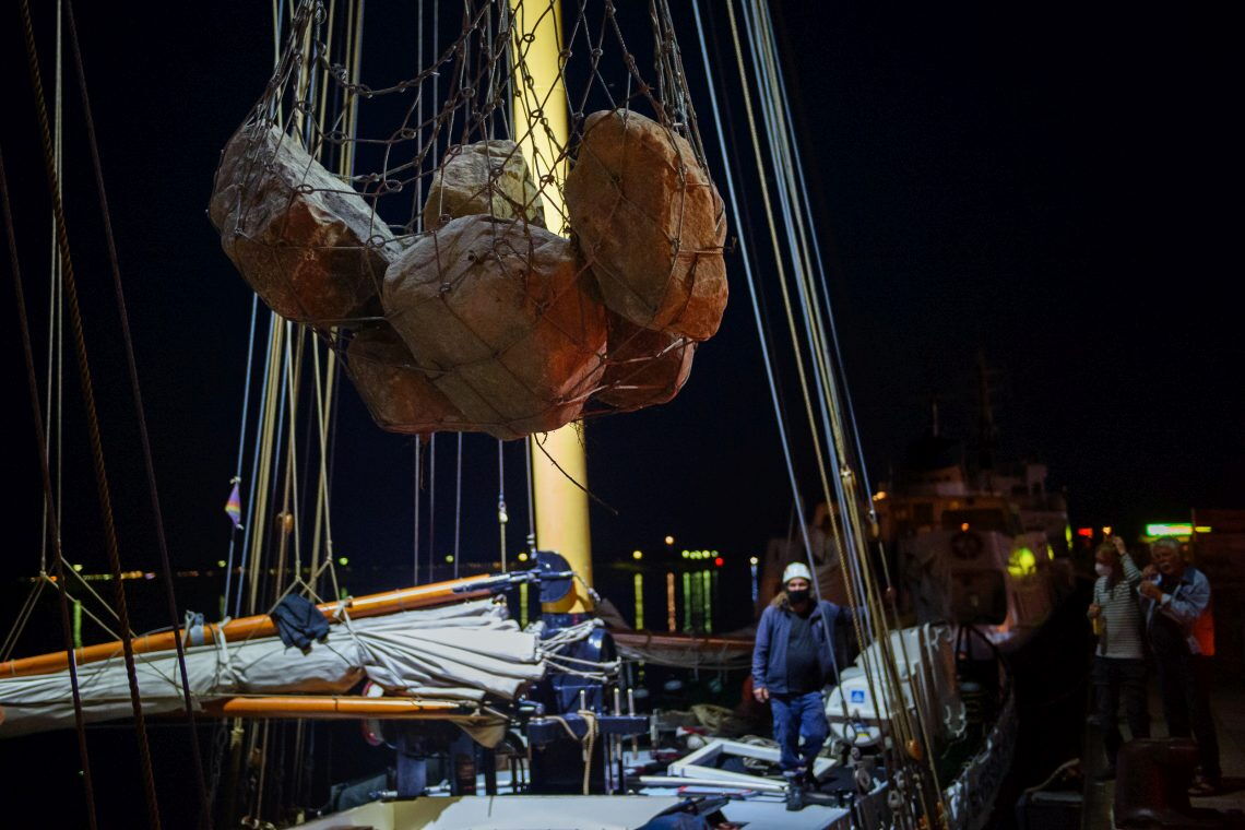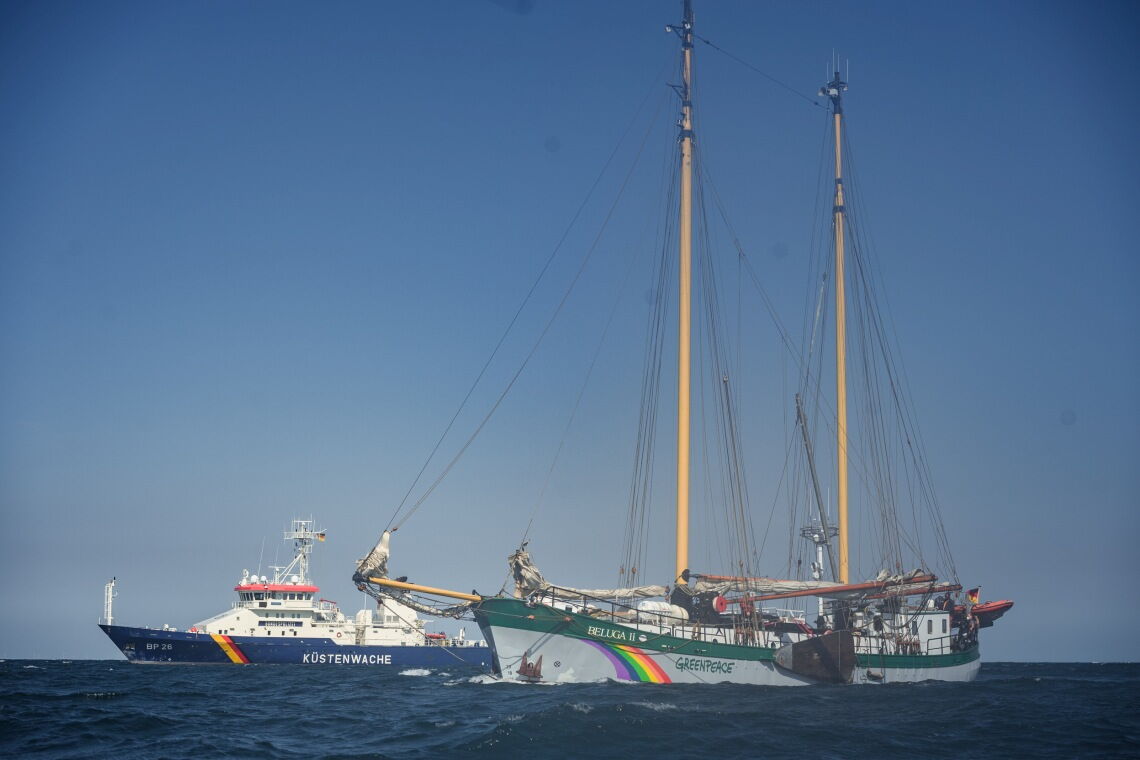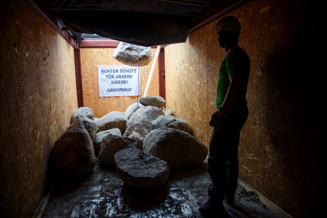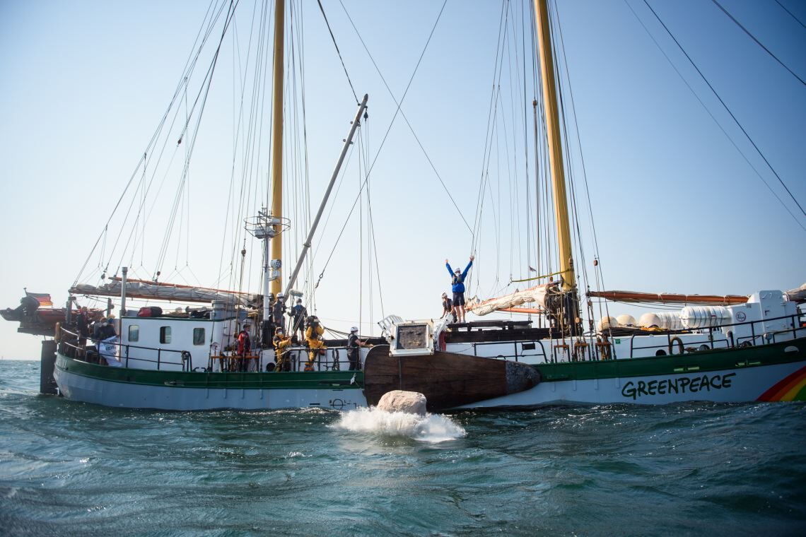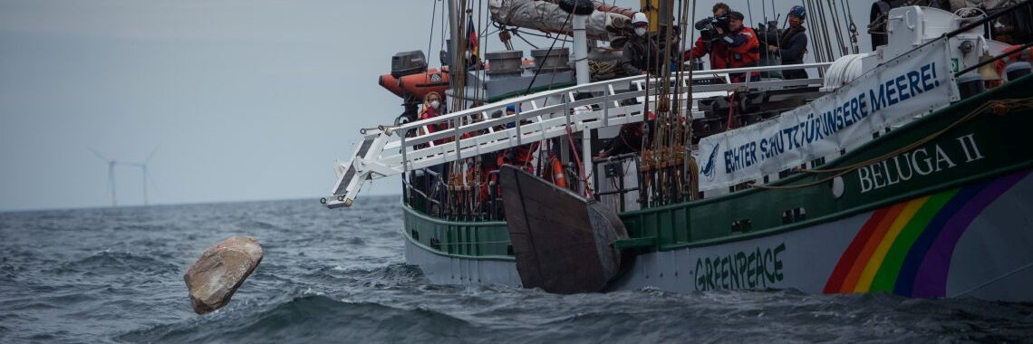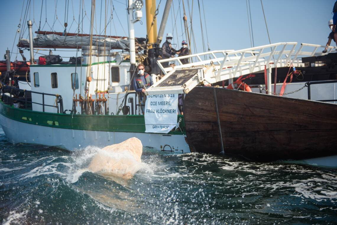 Das Greenpeace-Schiff „Beluga II“ versenkt einen Stein im Schutzgebiet Adlergrund in der Ostsee.