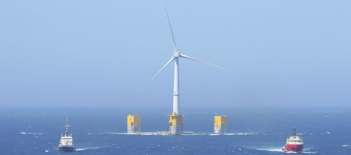Offshore-Wind à la française: Vor der bretonischen Küste erzeugt seit 2018 ein Windrad von Floatgen auf einem Betonschwimmer Strom.